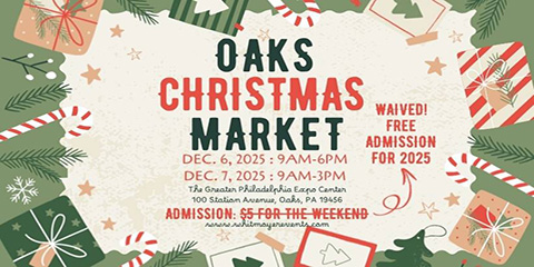 Join us for the 2nd Annual Oaks Christmas Market on Saturday, December 6, 2025 from 9 a.m. to 6 p.m. and Sunday, December 7, 2025 from 9 a.m. to 3 p.m. at the Greater Philadelphia Expo Center! This year’s event can accommodate nearly 300 crafters and vendors in Hall C.
